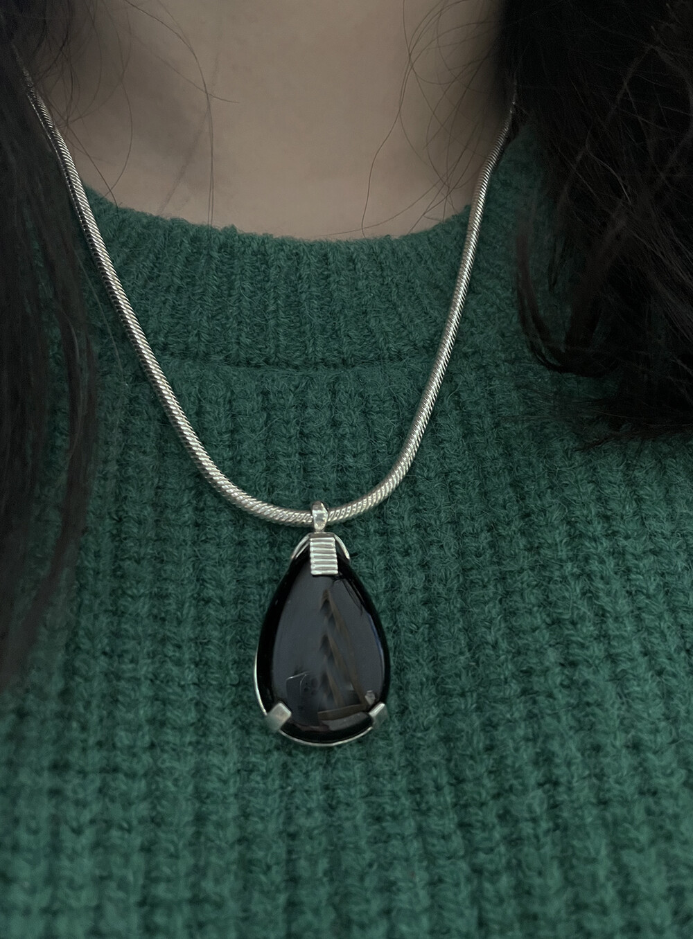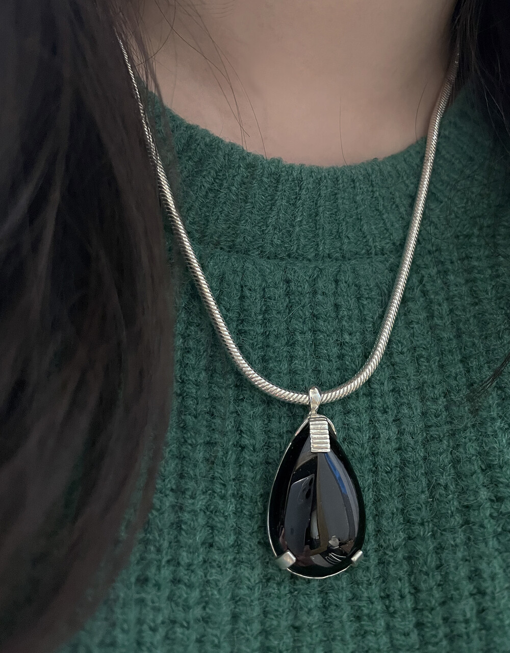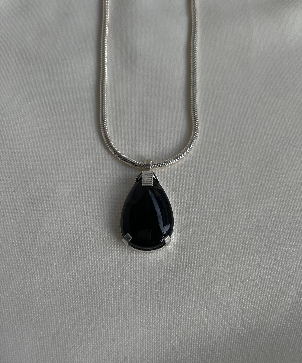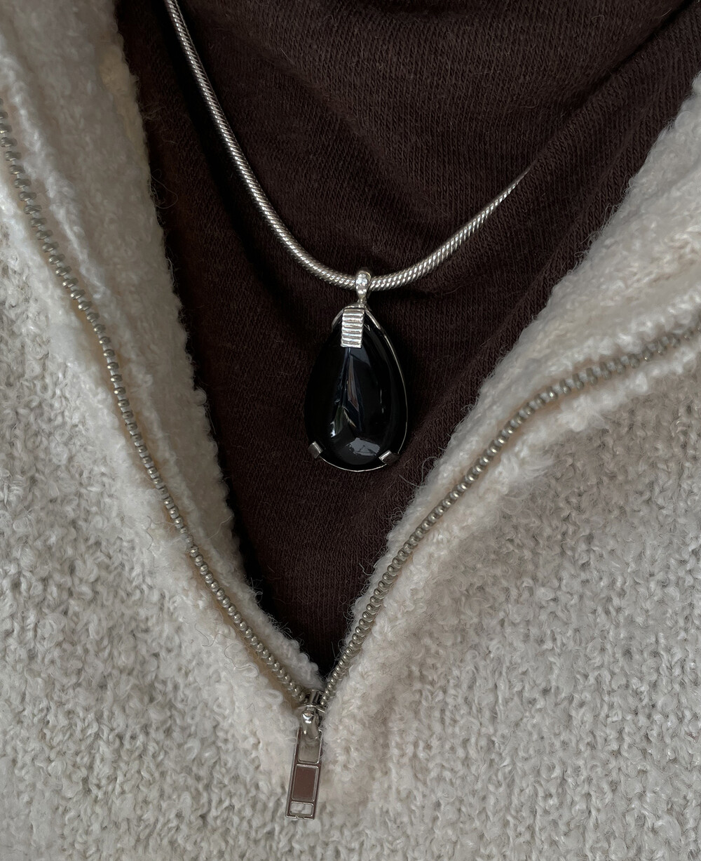 크기감 있는 오닉스 펜던트가 자연스럽게 시선을 사로잡으며,