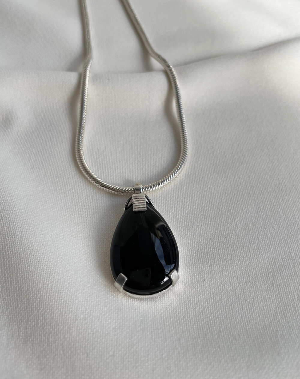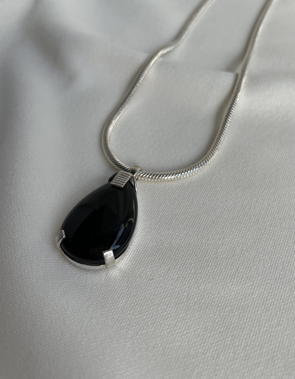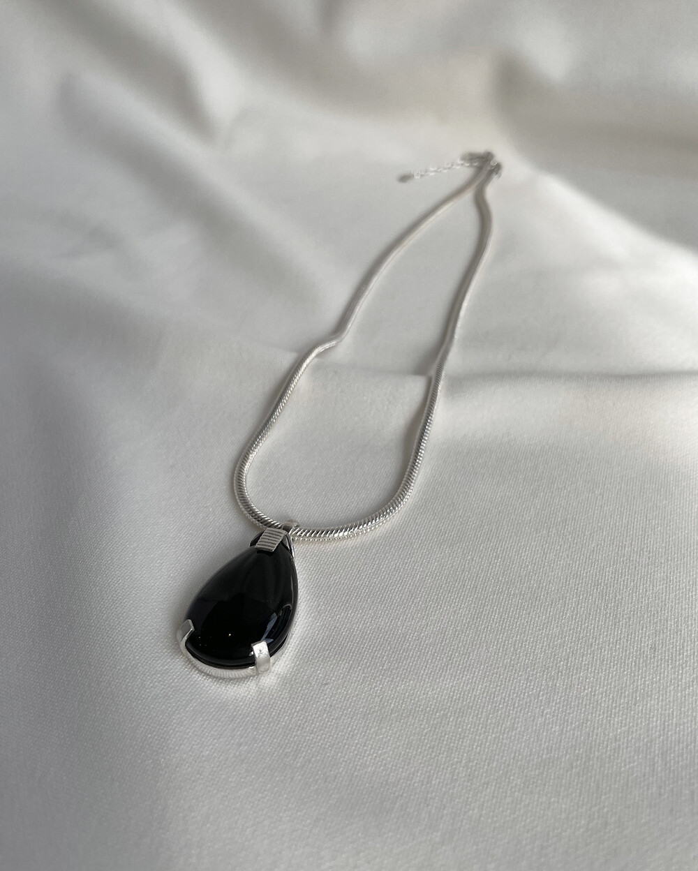 크기감 있는 오닉스 펜던트가 자연스럽게 시선을 사로잡으며,