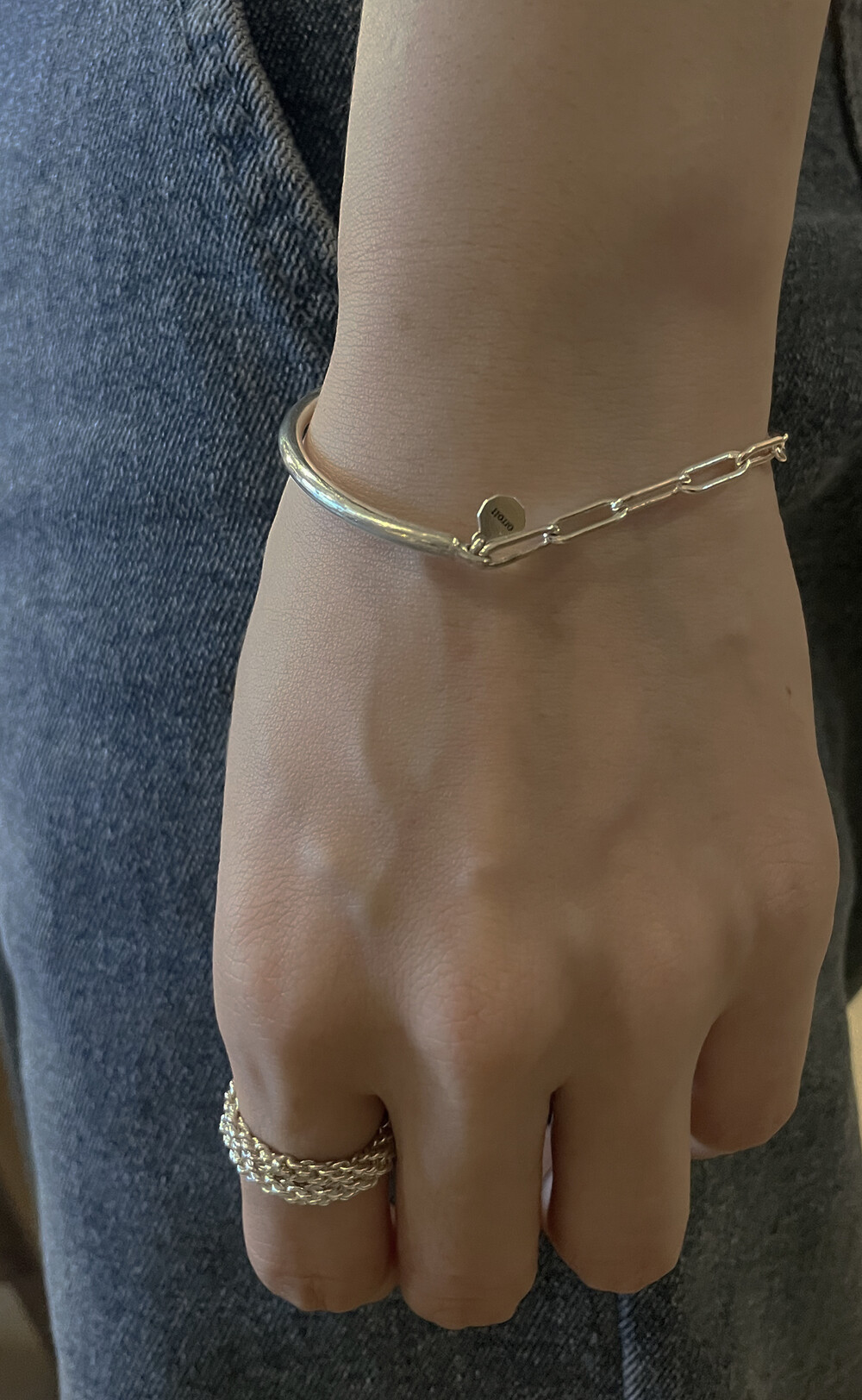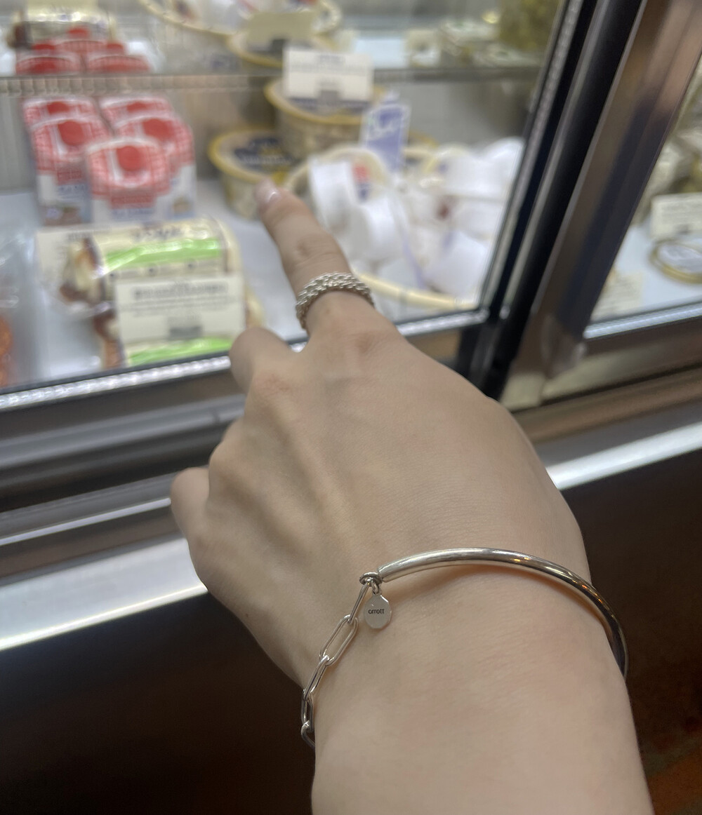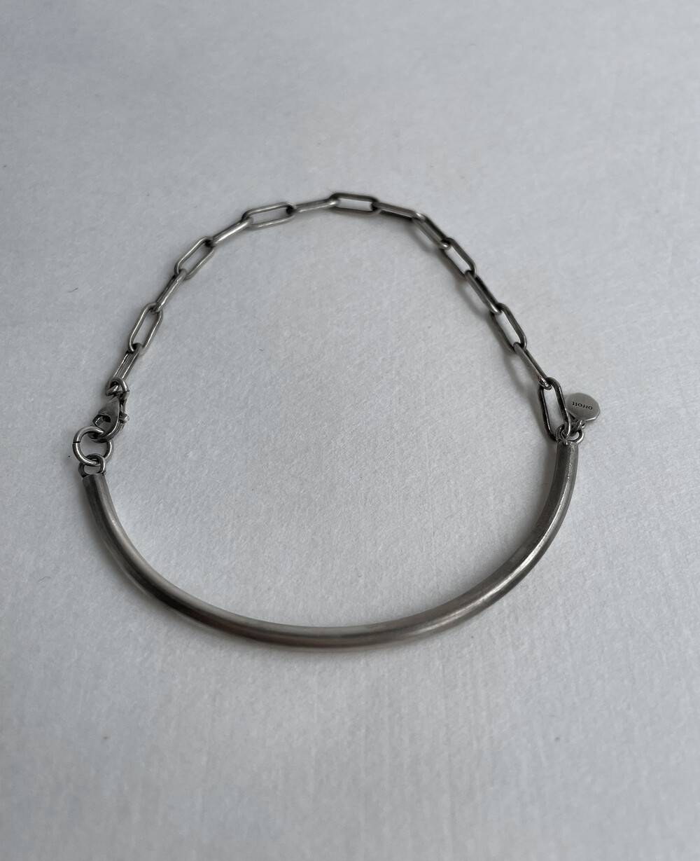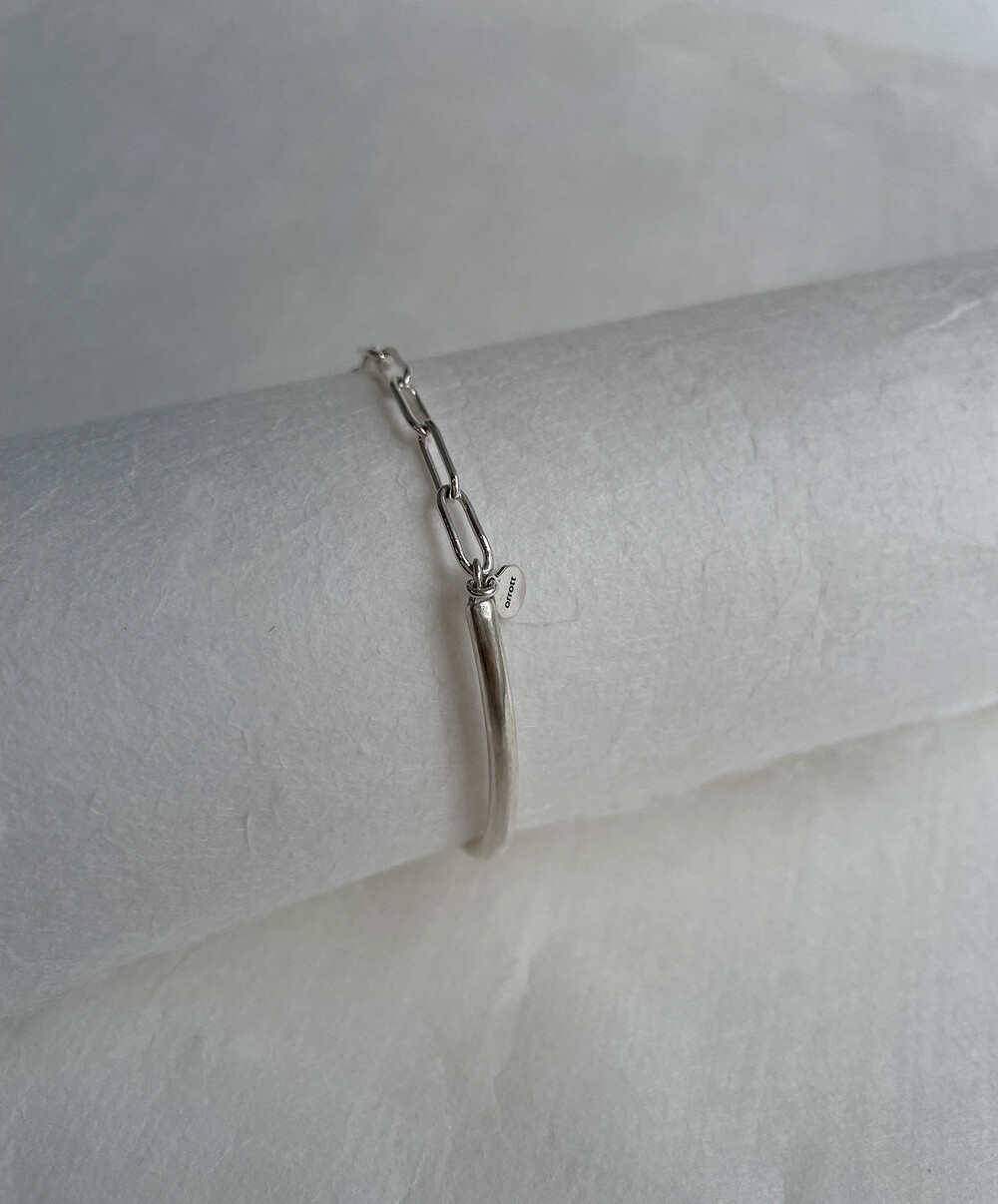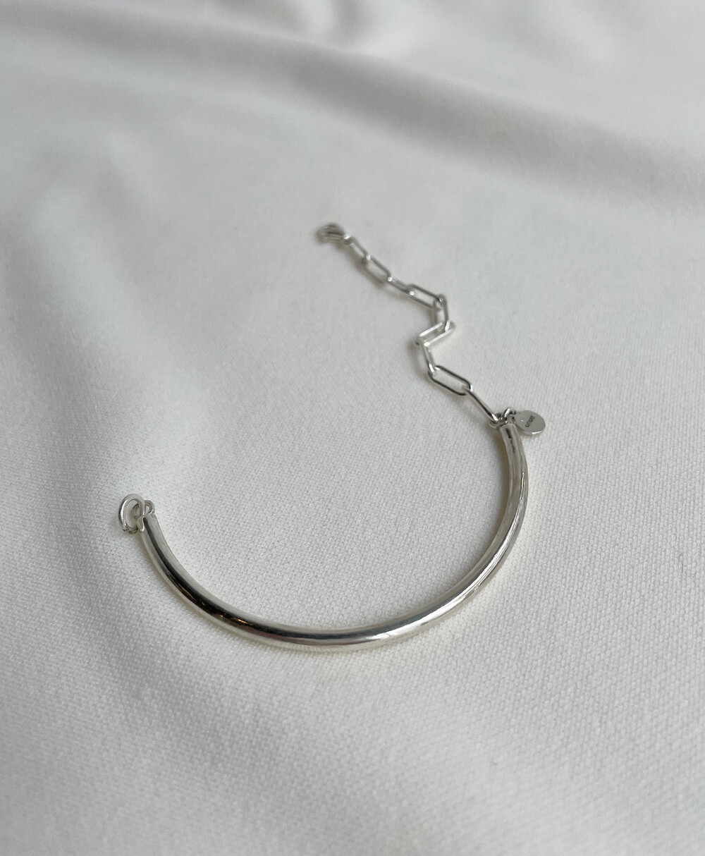 실버바와 체인으로 유니크하게 제작된 하프 뱅글 팔찌입니다.