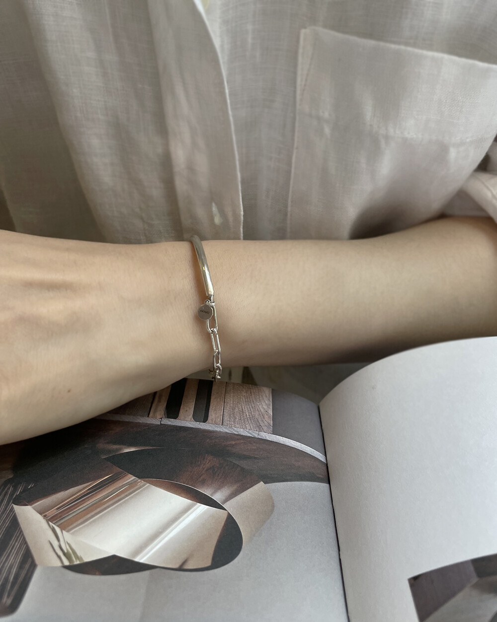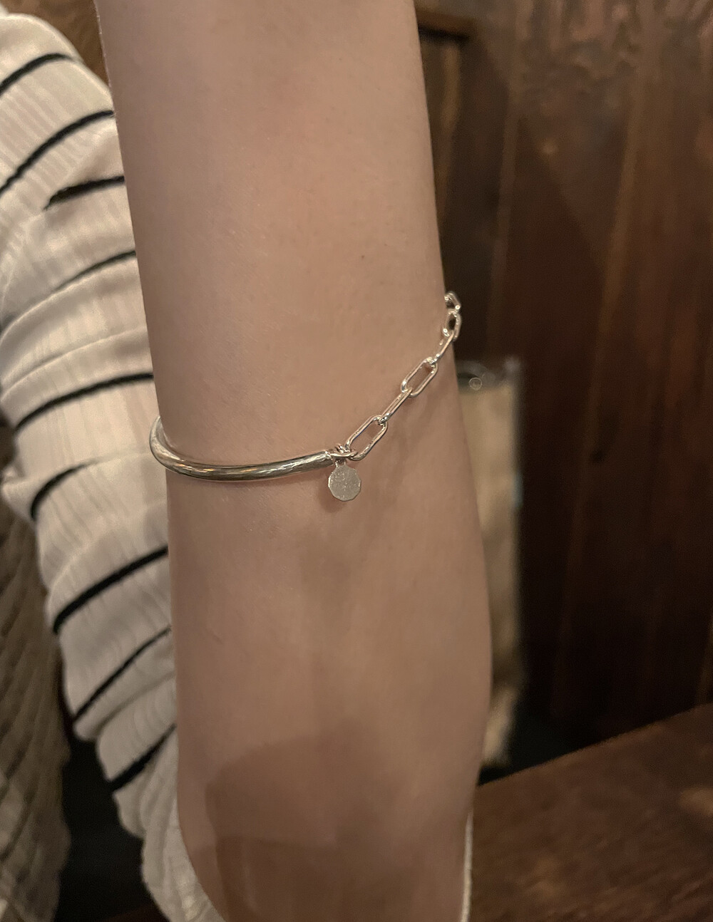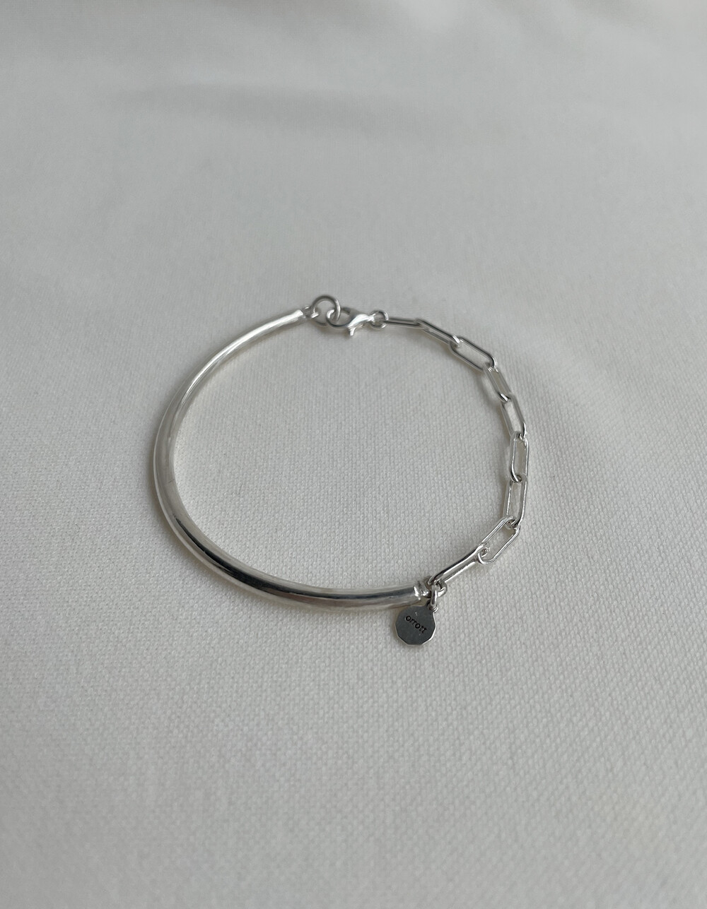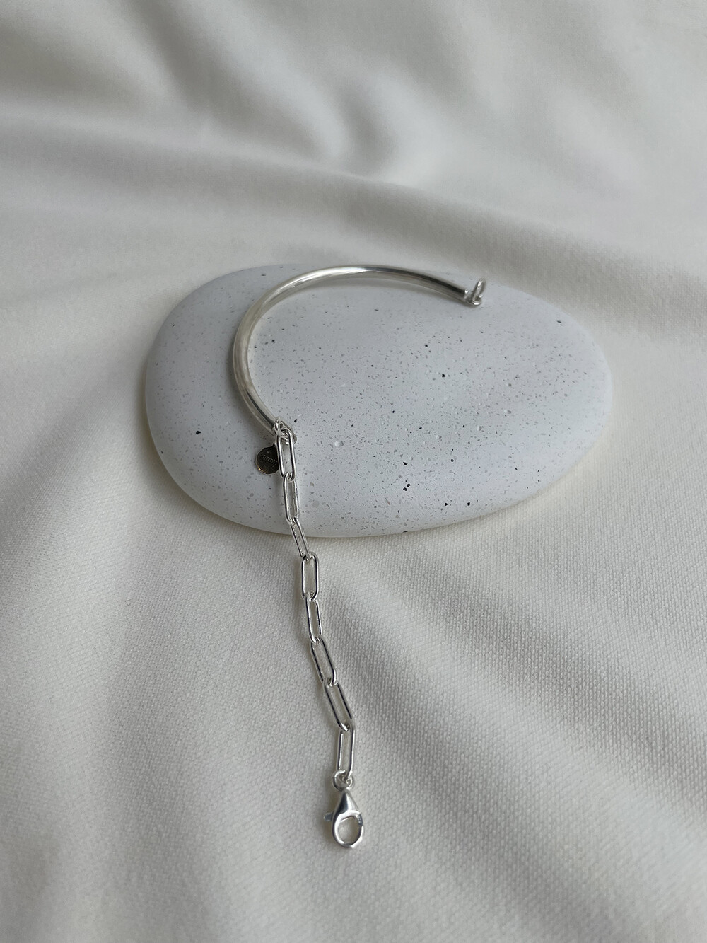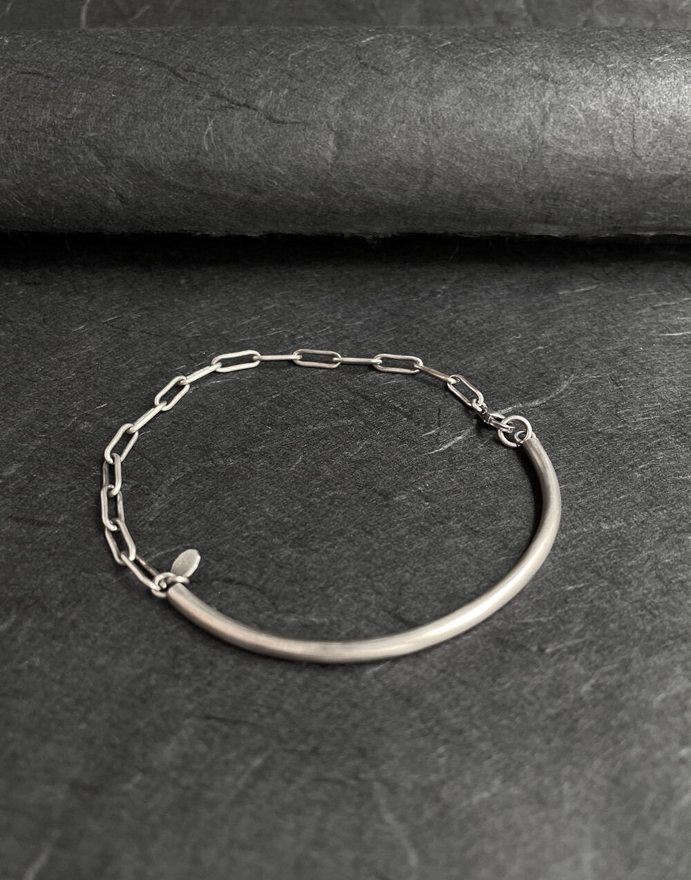 실버바와 체인으로 유니크하게 제작된 하프 뱅글 팔찌입니다.