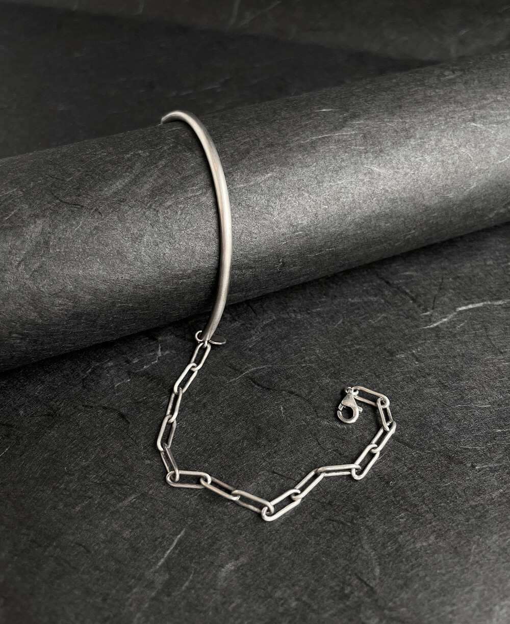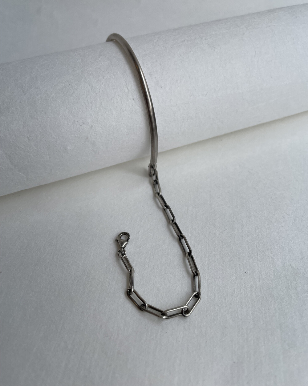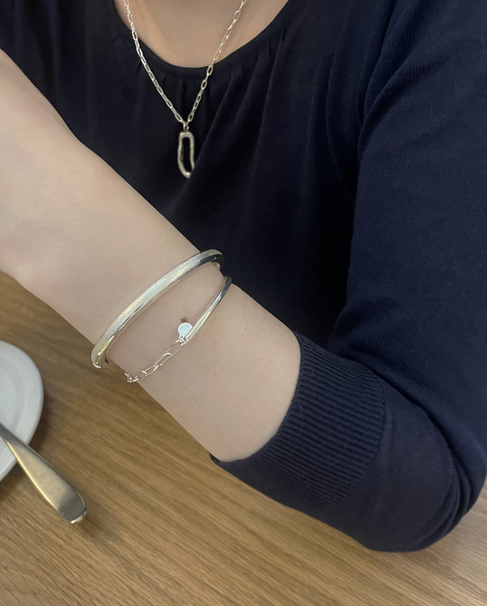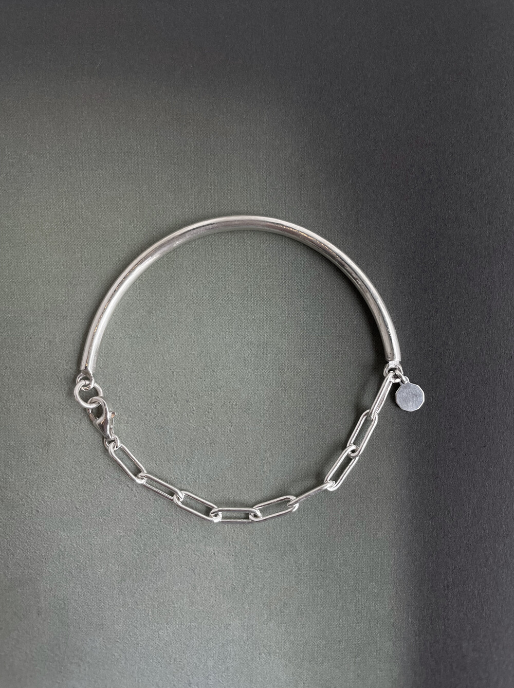 실버바와 체인으로 유니크하게 제작된 하프 뱅글 팔찌입니다.