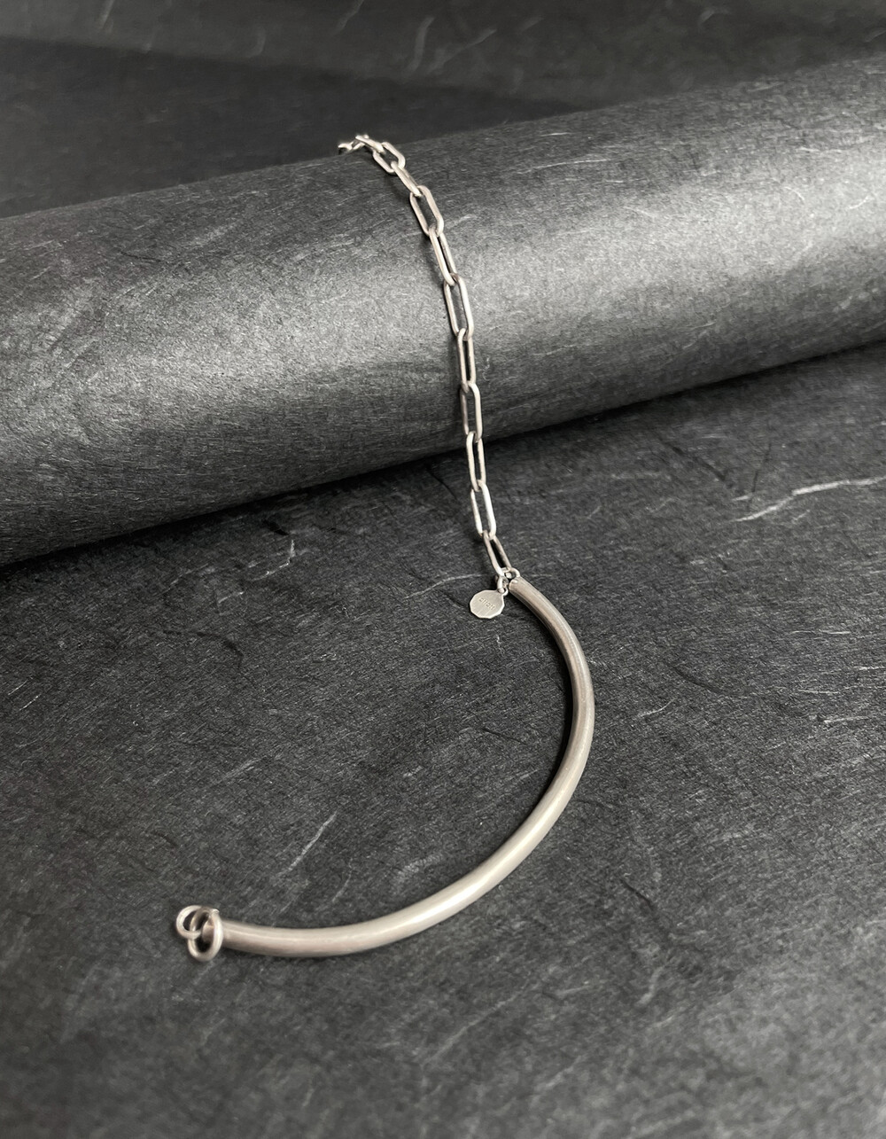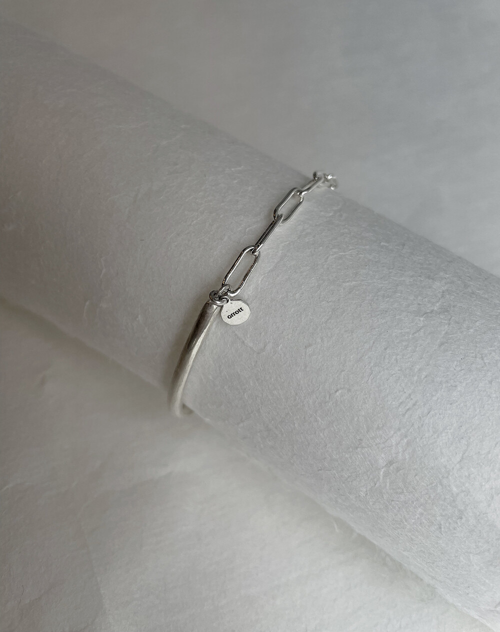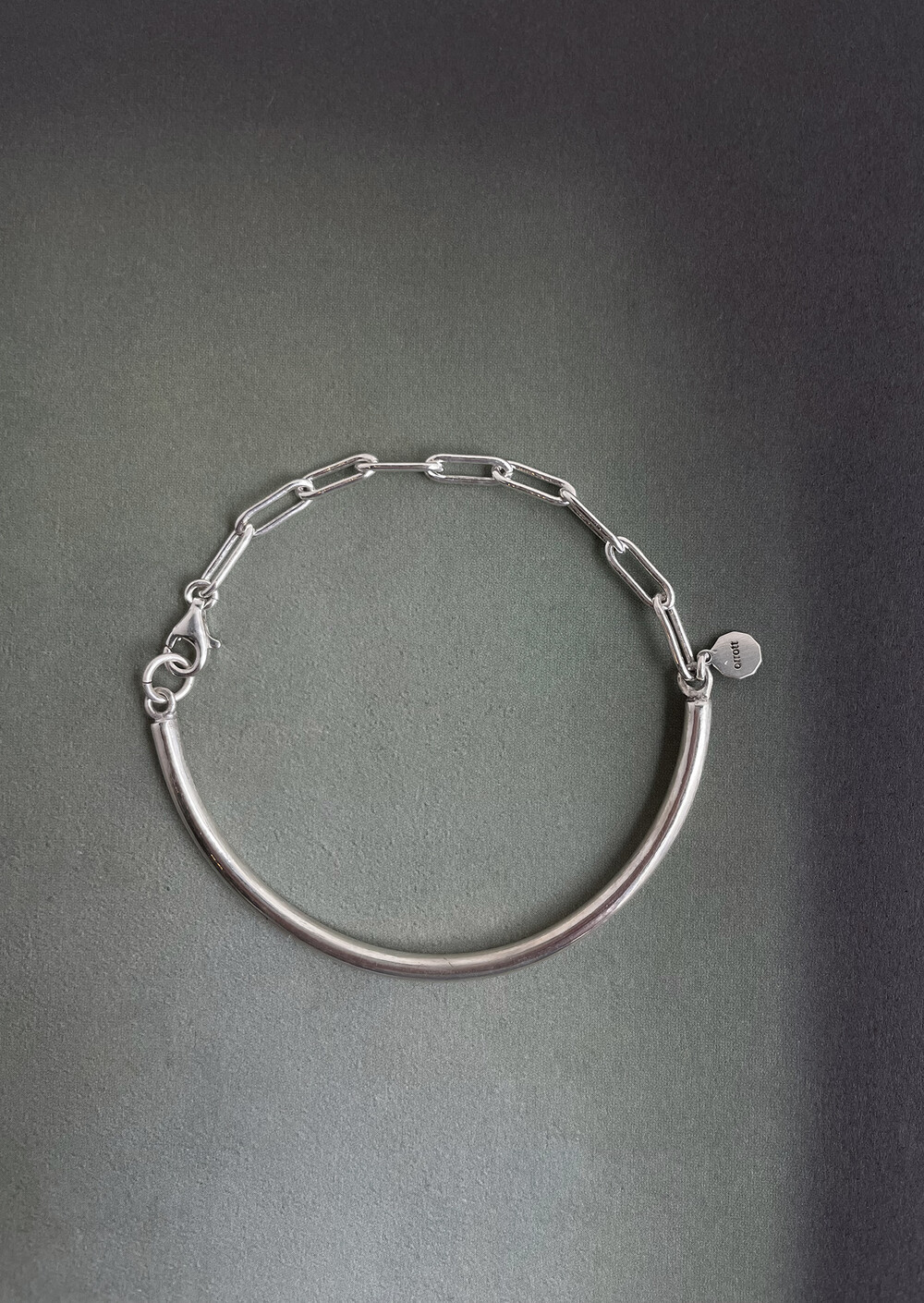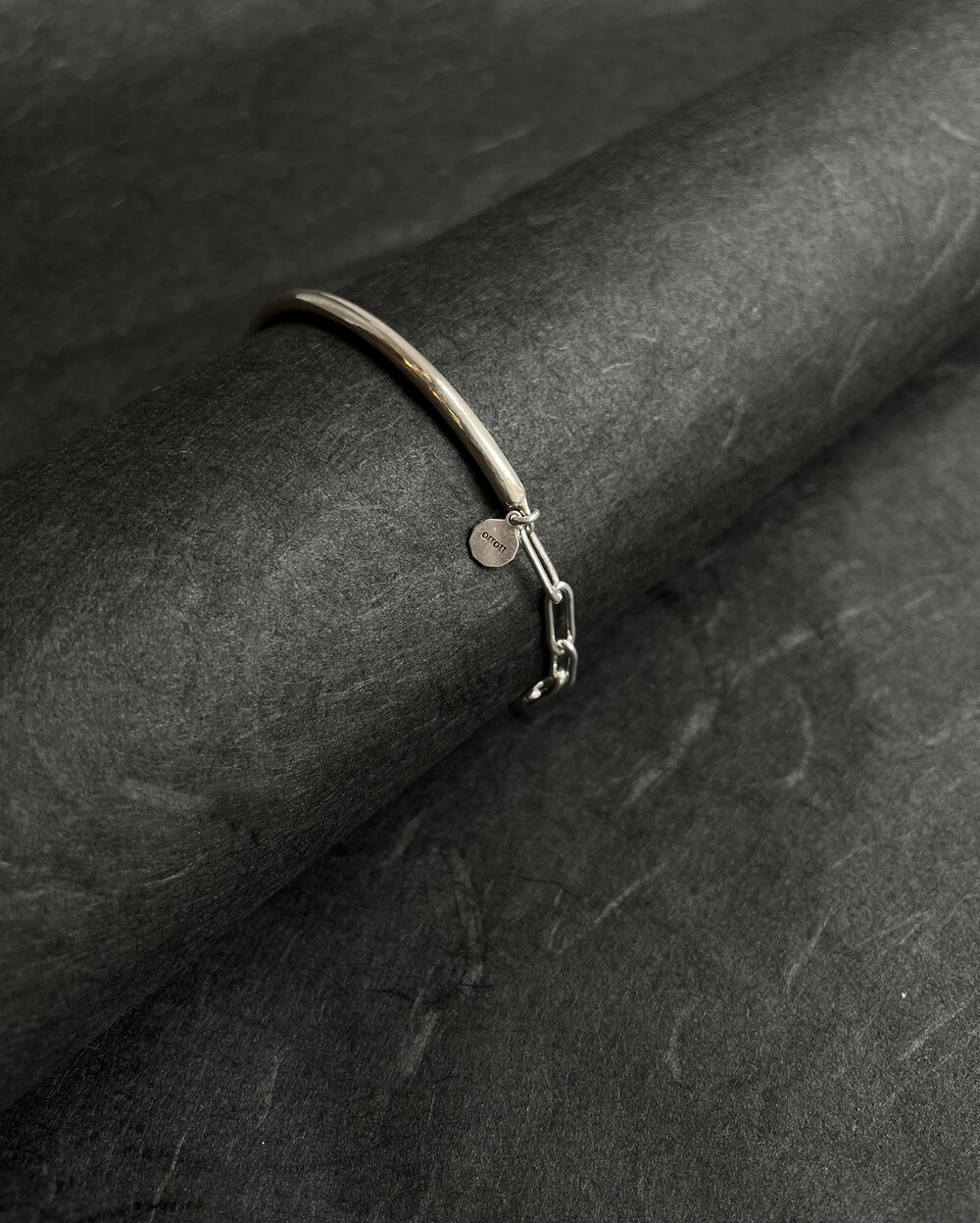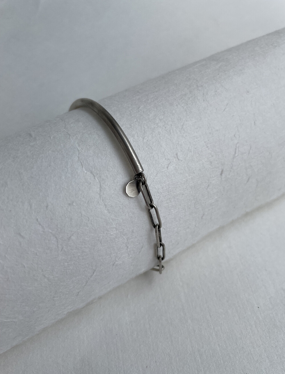 실버바와 체인으로 유니크하게 제작된 하프 뱅글 팔찌입니다.