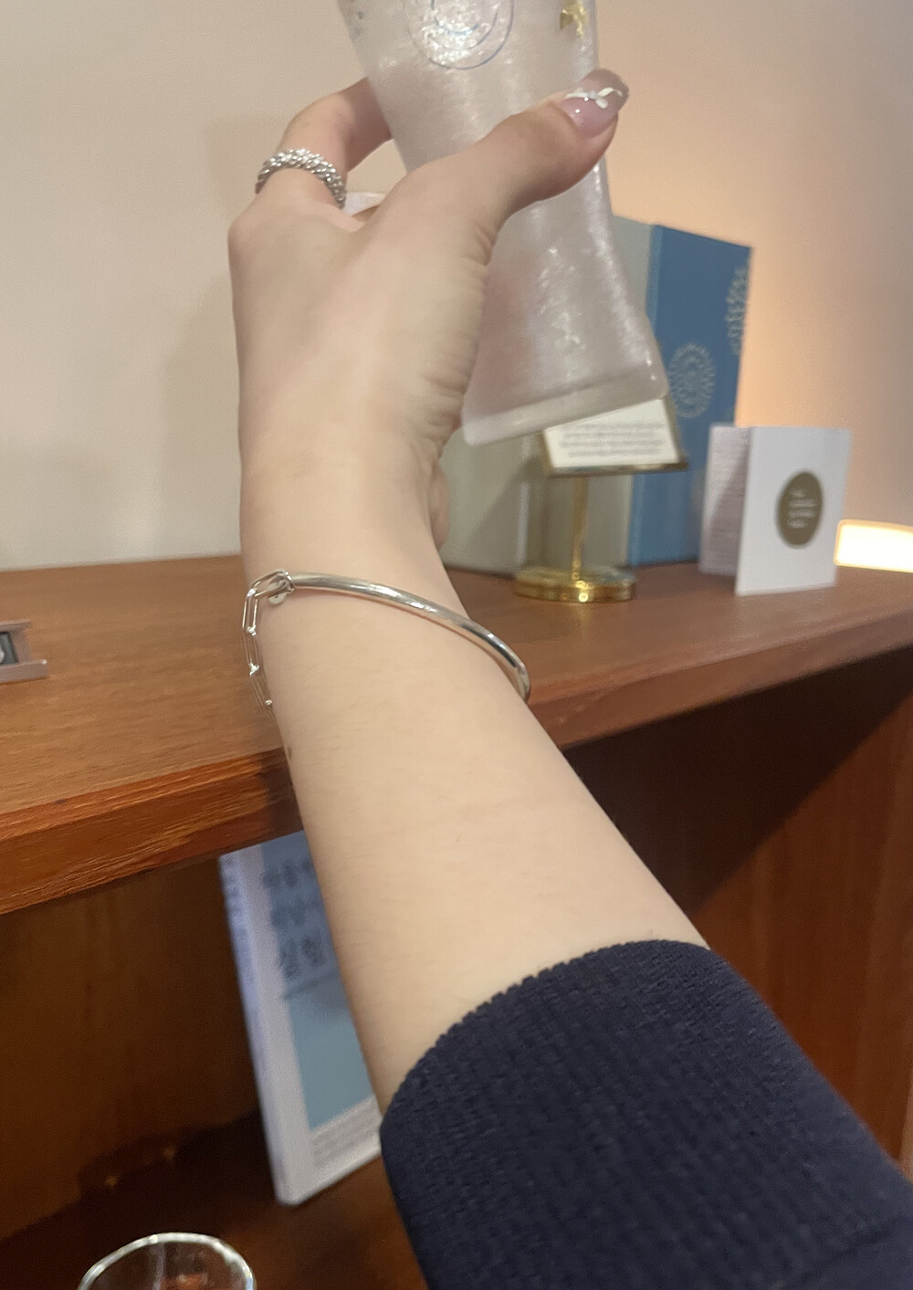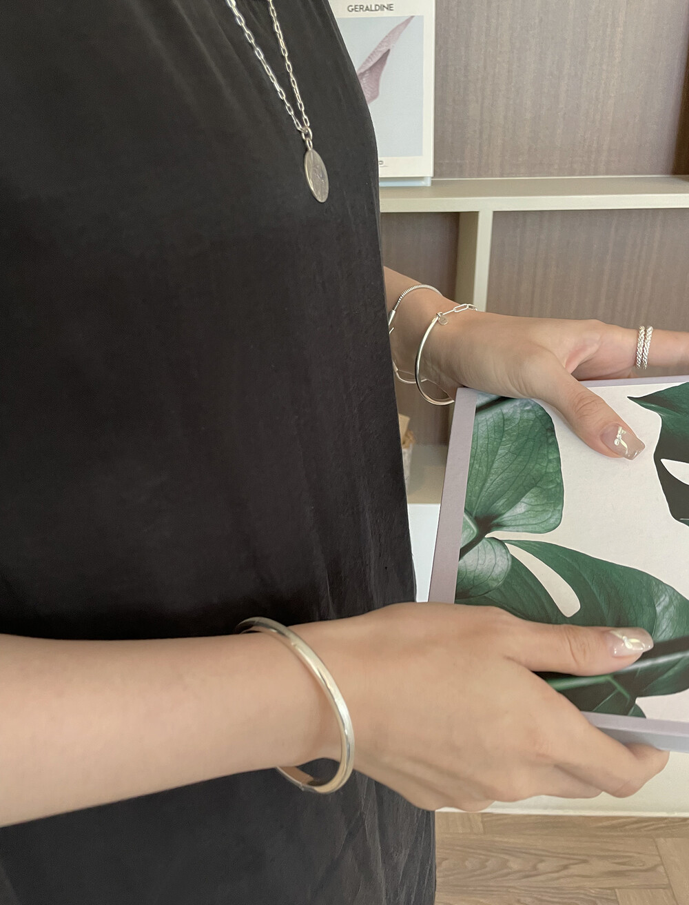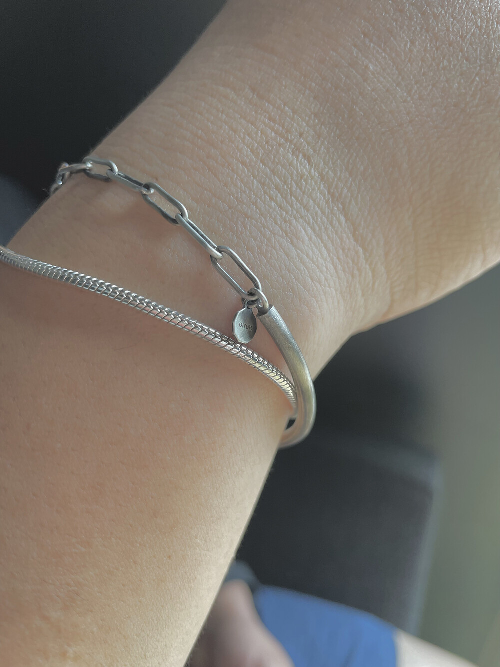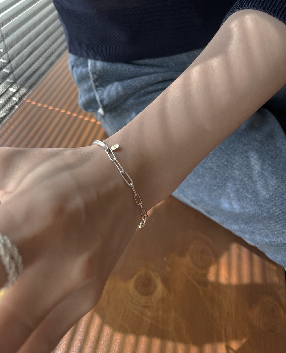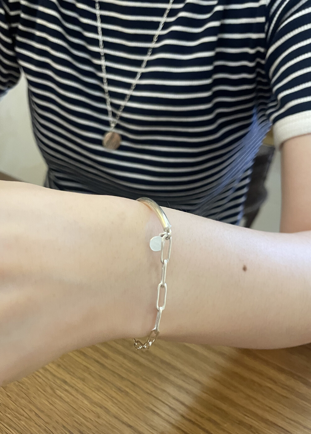 실버바와 체인으로 유니크하게 제작된 하프 뱅글 팔찌입니다.