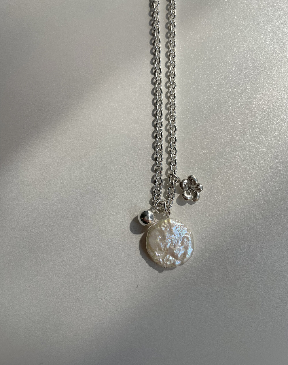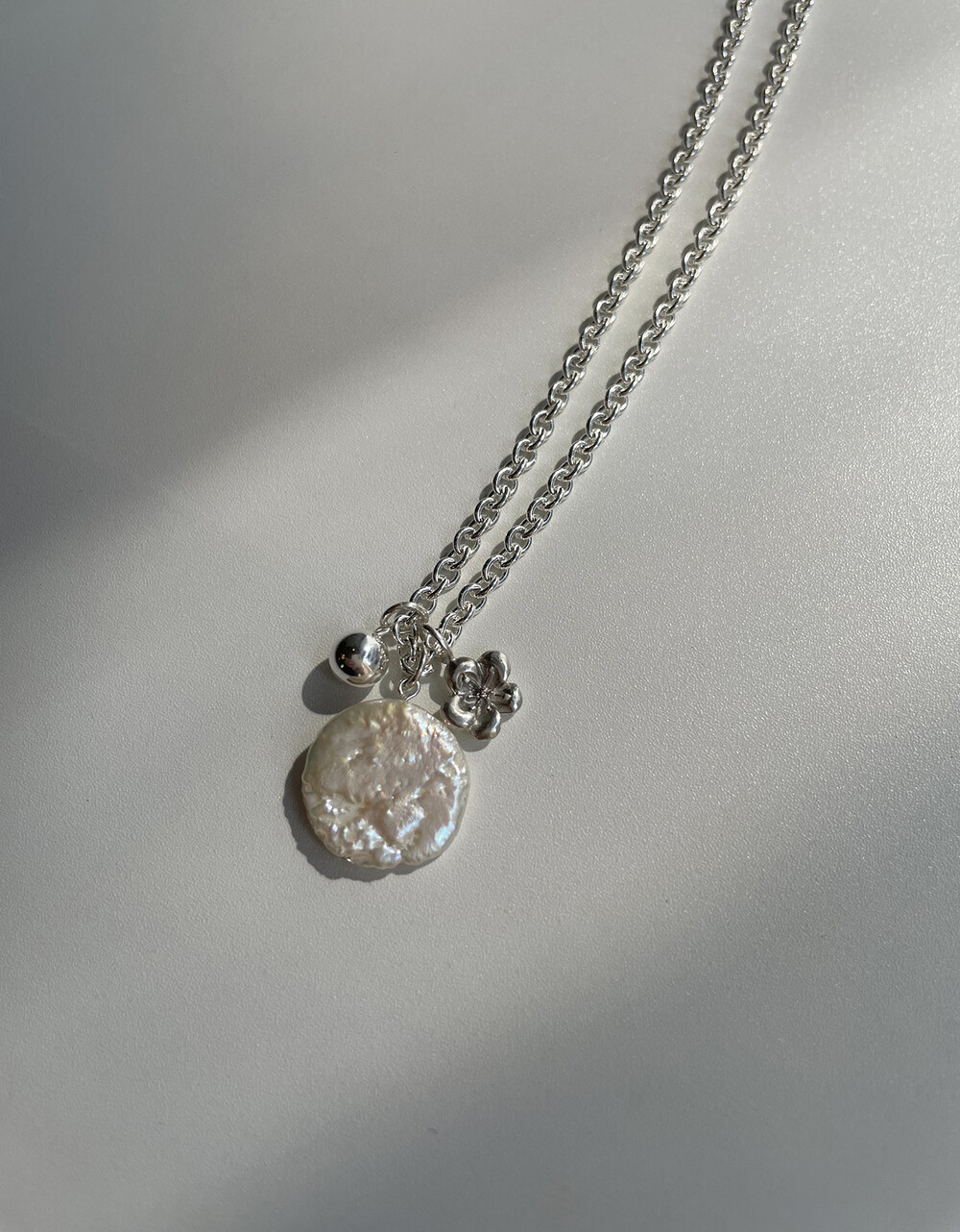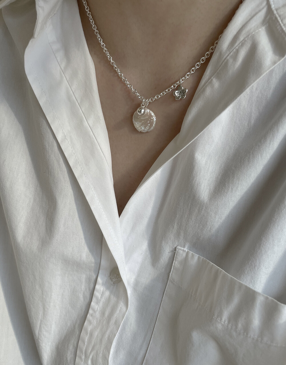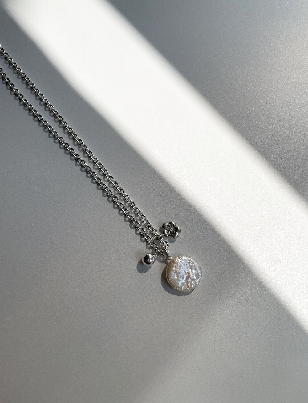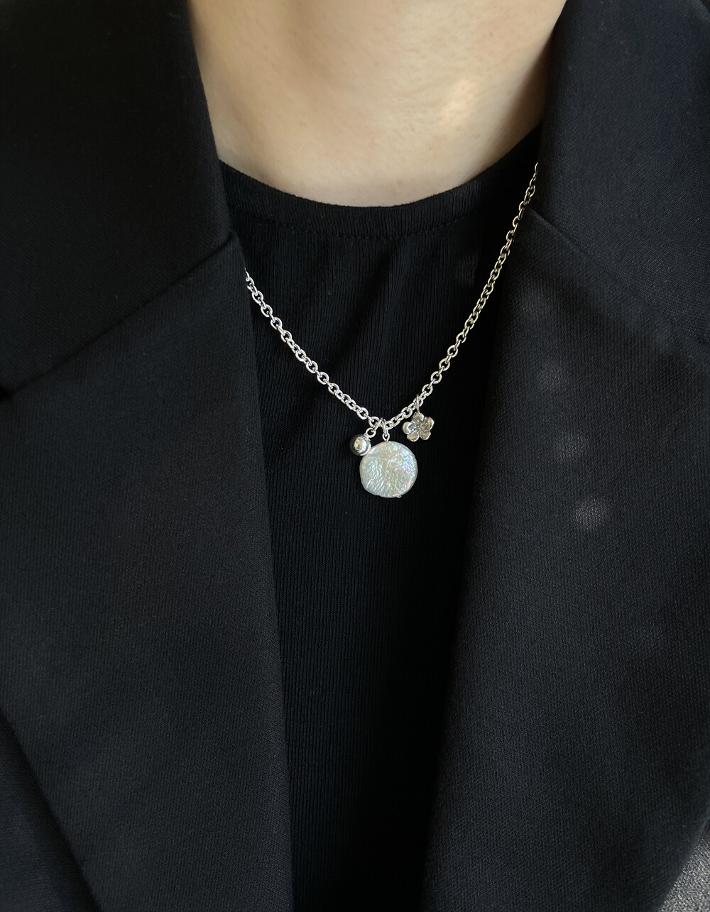 미니멀한 실버볼과 플라워 참이 조화를 이루며감각적인 스타일을 완성해주는 목걸이입니다.