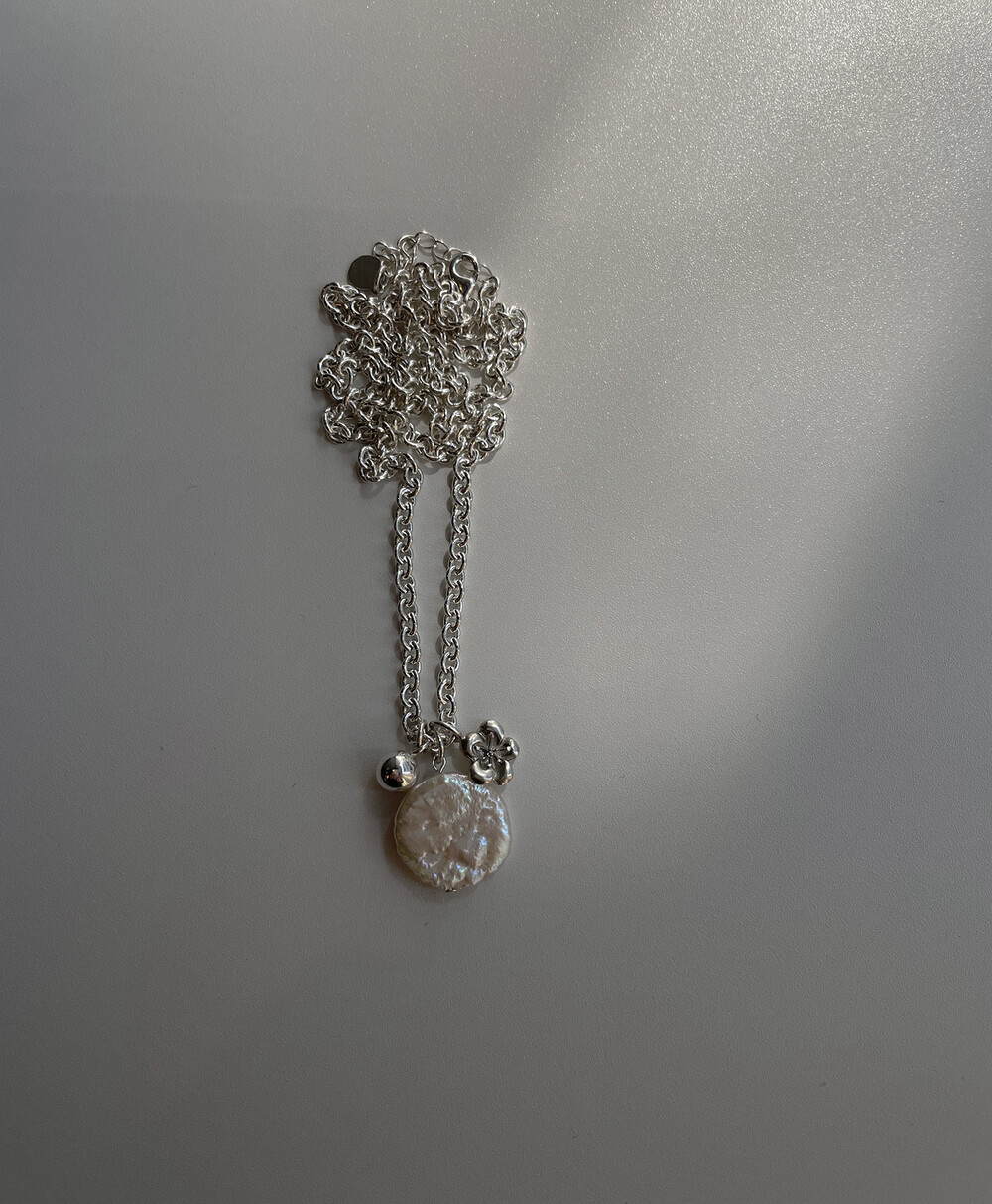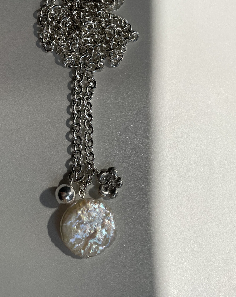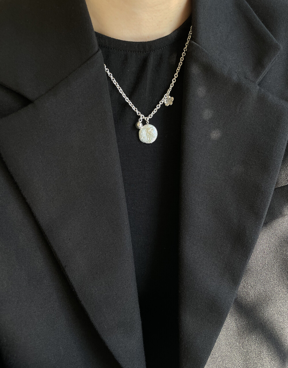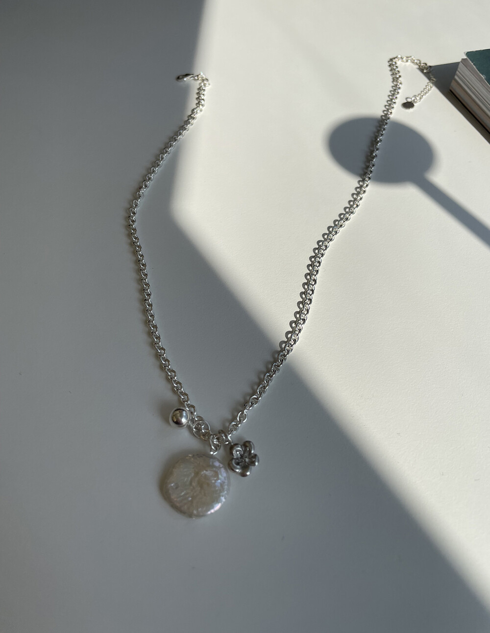 미니멀한 실버볼과 플라워 참이 조화를 이루며감각적인 스타일을 완성해주는 목걸이입니다.