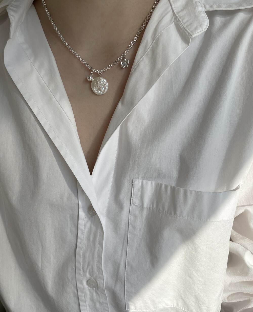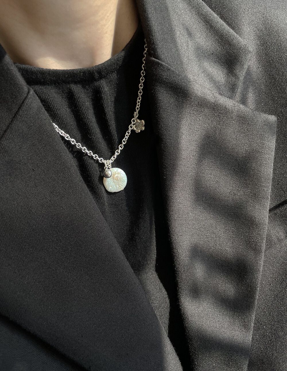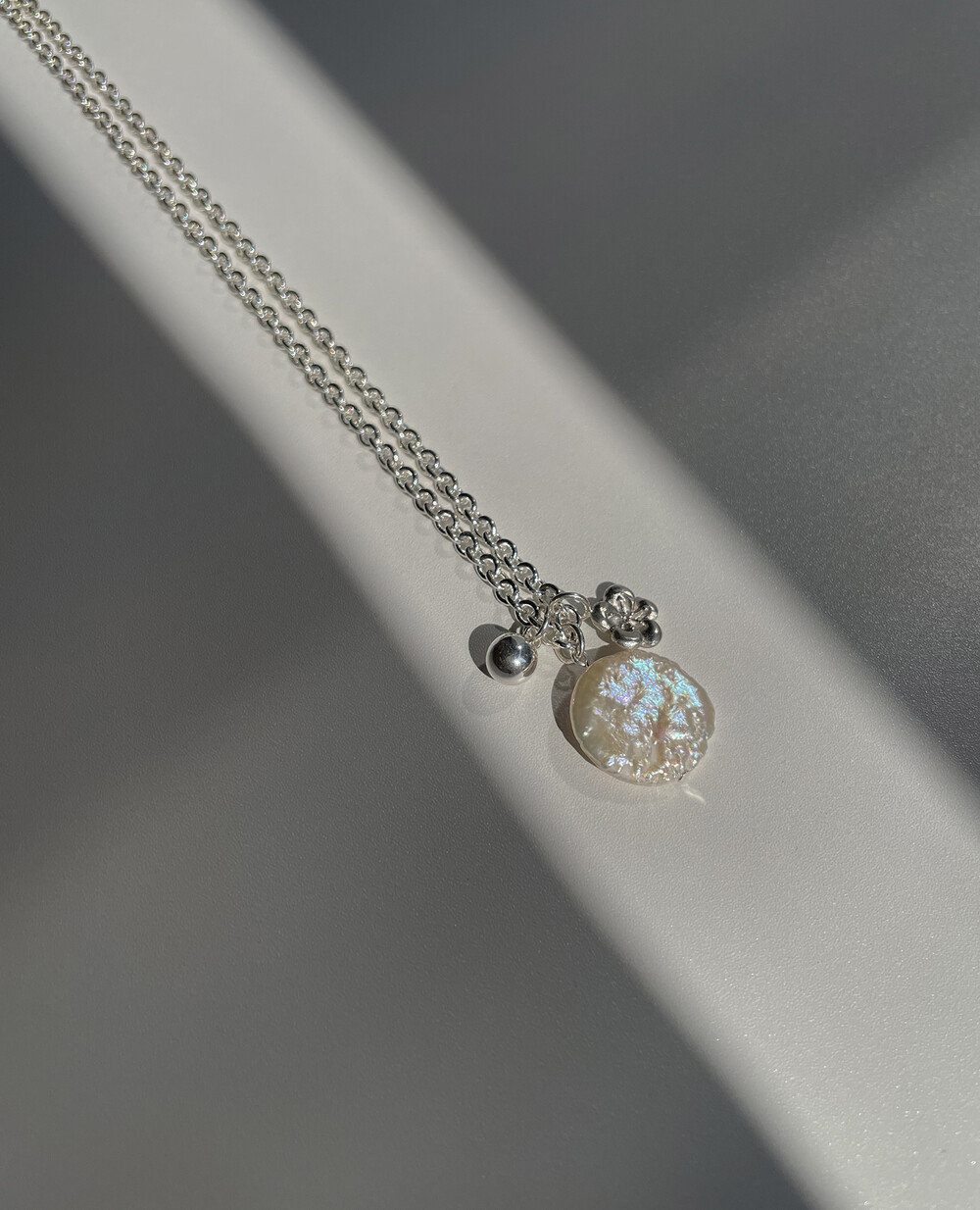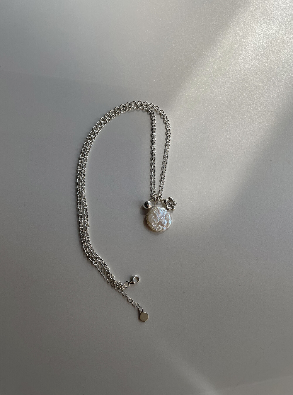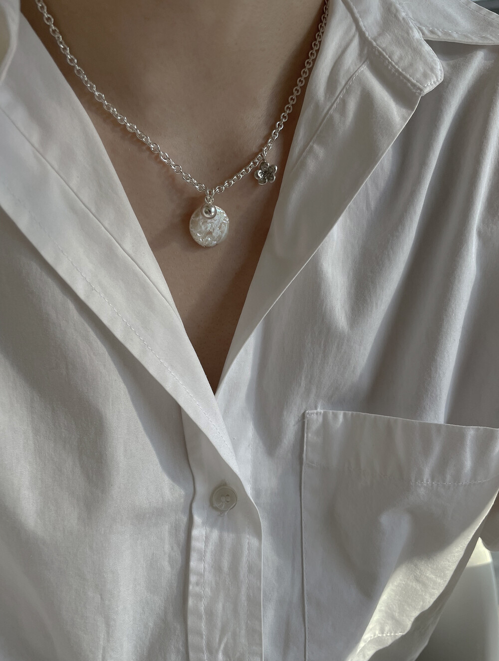 미니멀한 실버볼과 플라워 참이 조화를 이루며감각적인 스타일을 완성해주는 목걸이입니다.