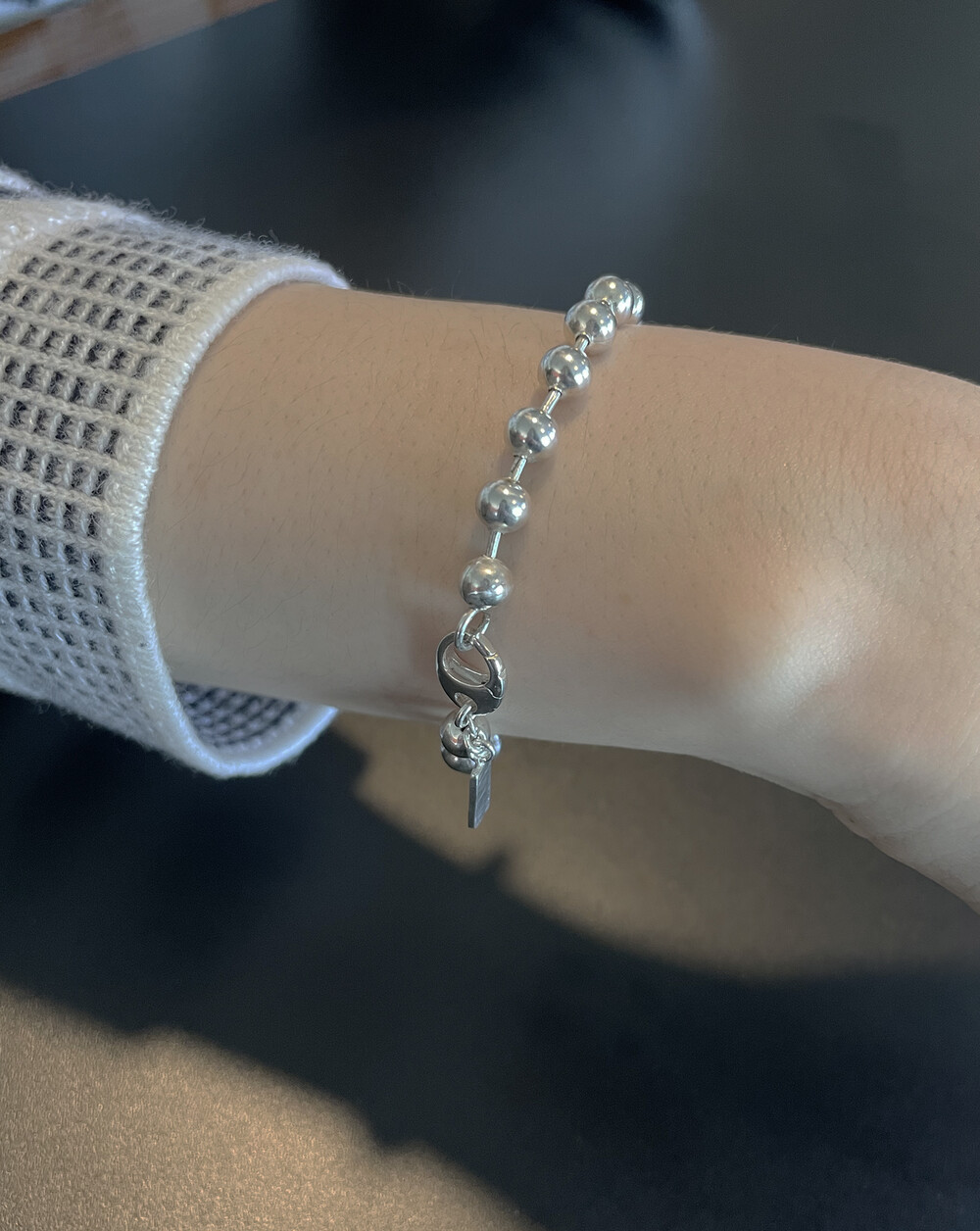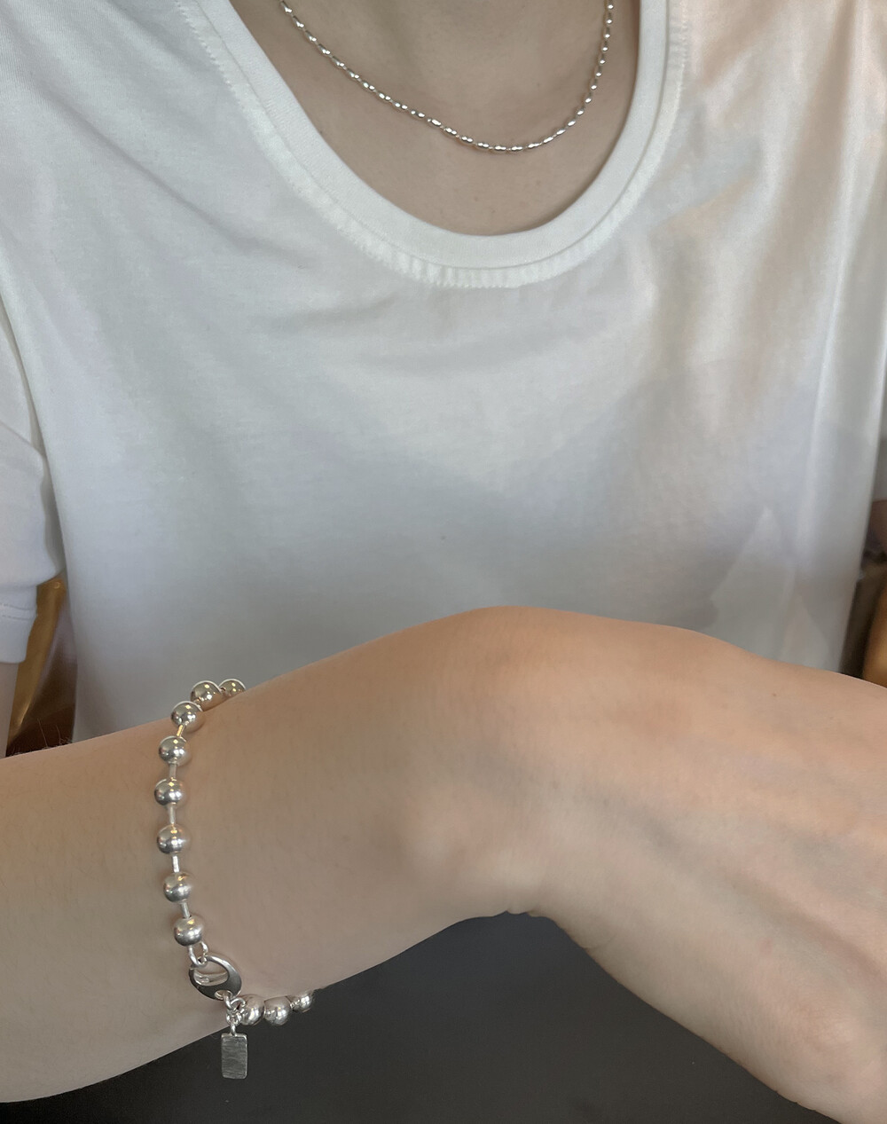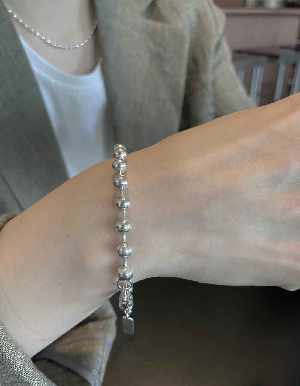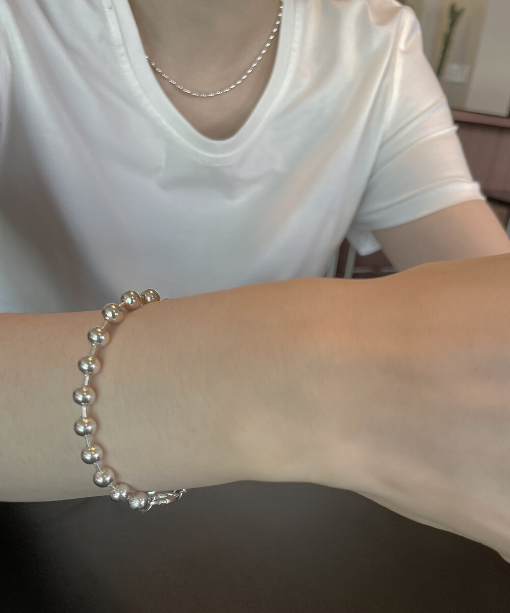 현대적인 디자인의 실버 볼 체인 팔찌로 부드럽게 손목을 감싸며,