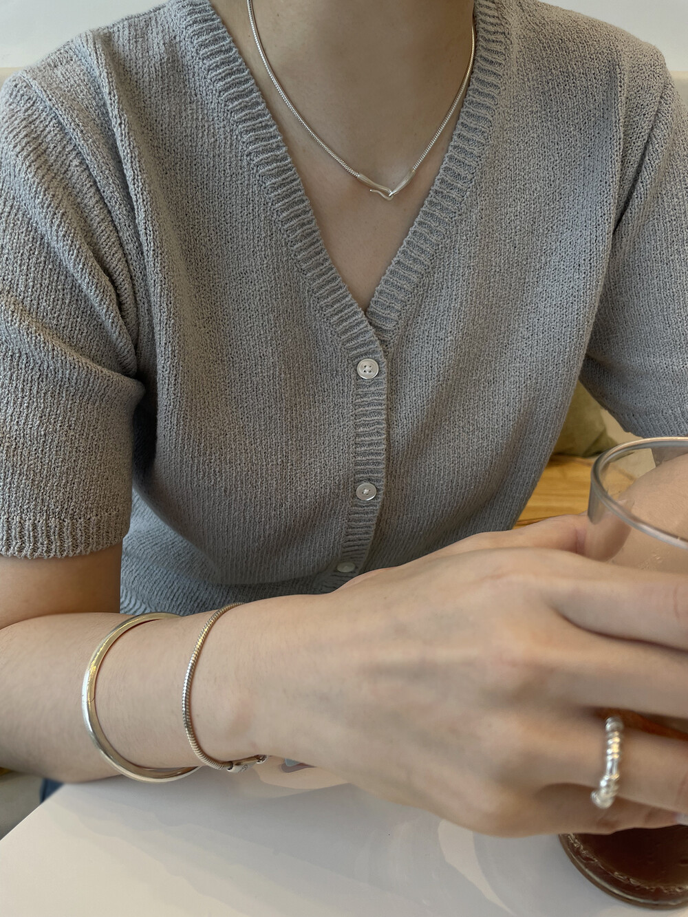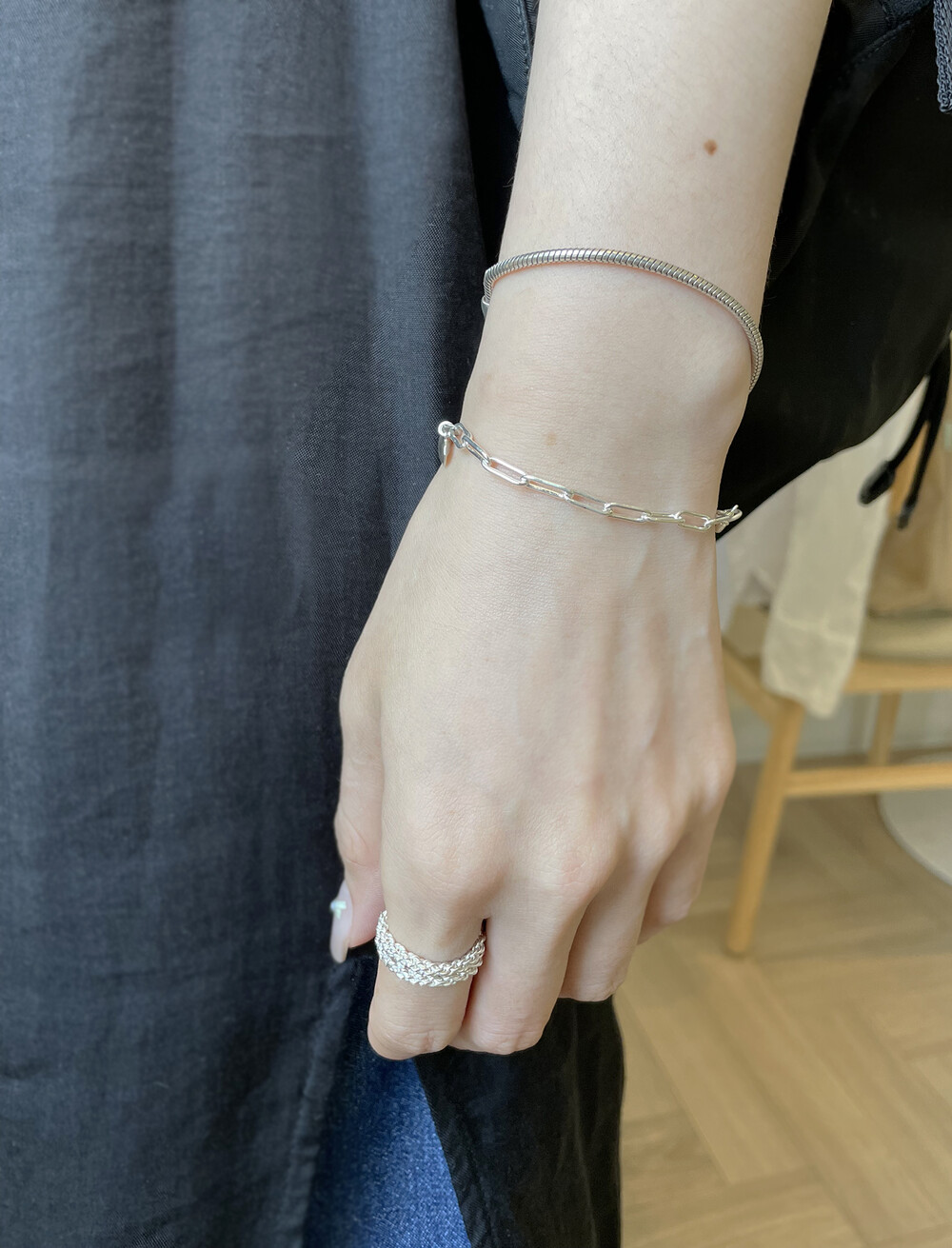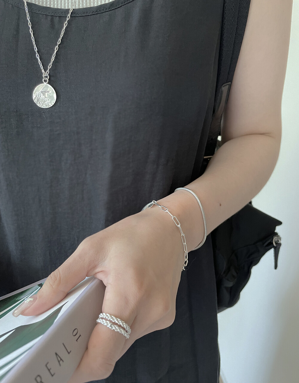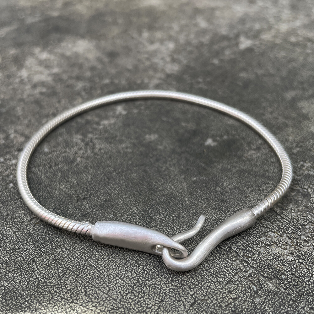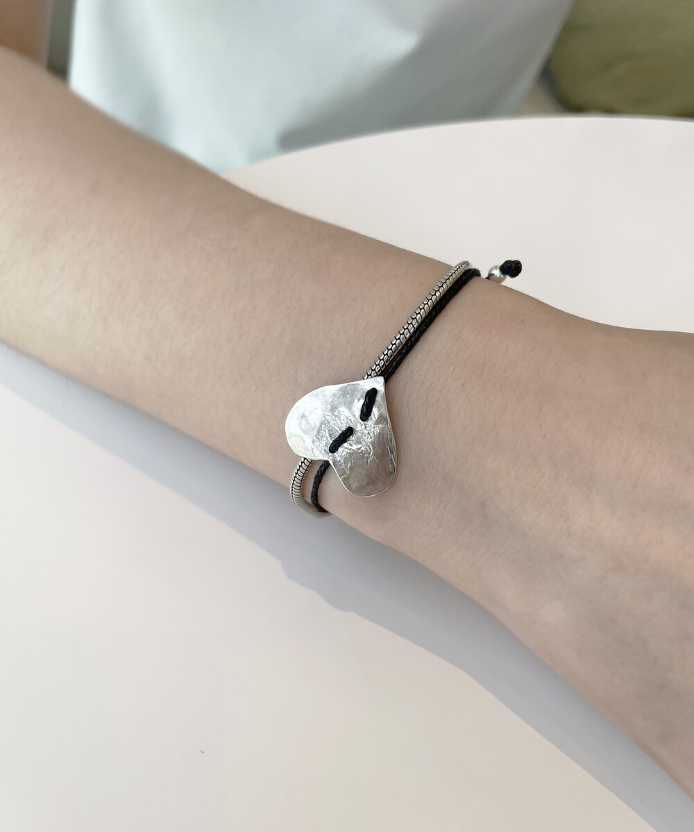 매트하며 유니크한 고리 장식이 특징인 팔찌입니다.
